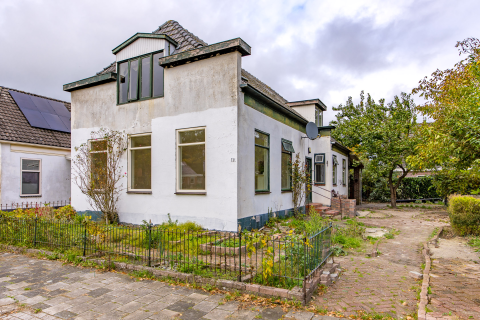 Aan rand van de woonwijk aan vijver gelegen uitgebouwde helft van dubbel woonhuis met aangebouwde bijkeuken en berging op 328 m2 grond.